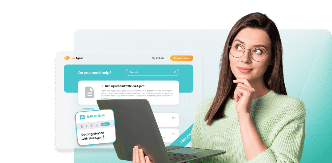 Creați articole profesionale pentru baza de cunoștințe cu editorul WYSIWYG al LiveAgent, cu instrume...