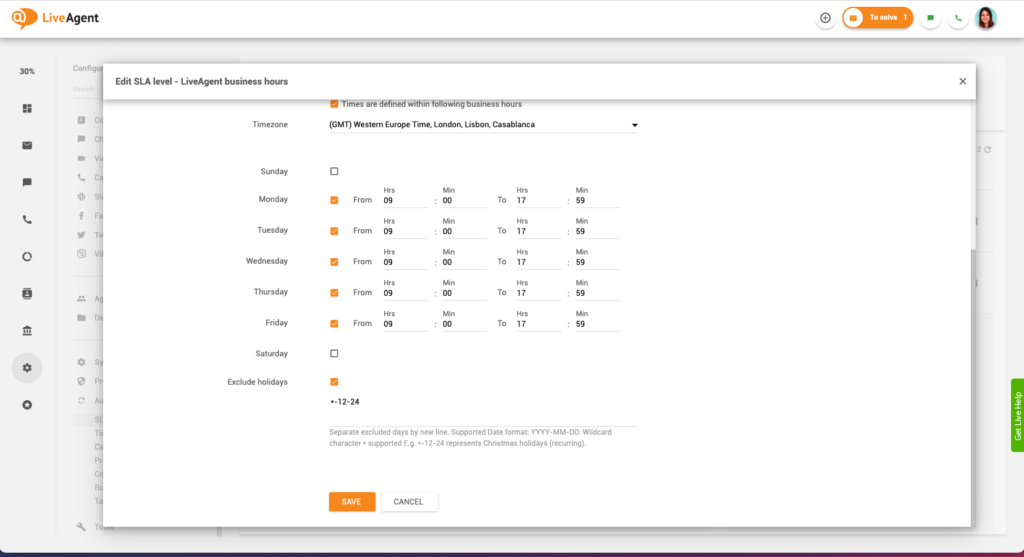 Orele de lucru ale LiveAgent vă configurează nivelurile SLA așa încât să fie puse în aplicare doar pe durata perioadelor specificate, cu posibilitatea de excludere a zilelor libere.