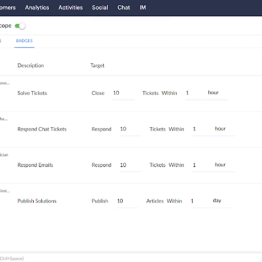 Una dintre caracteristicile cheie ale gamificării din Zoho Desk este sistemul de insigne. Agenții de asistență pot câștiga insigne pe baza performanței lor, cum ar fi “Mail Magician”, “Customer Delight” și “Ticket Terminator”. Aceste insigne sunt afișate pe profilul agentului, oferind recunoaștere pentru realizările sale. Zoho vă permite să adăugați și insigne personalizate.