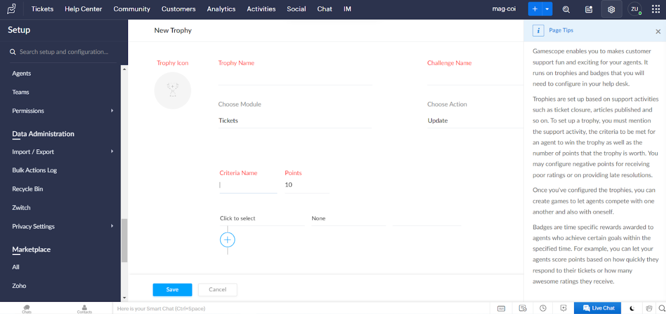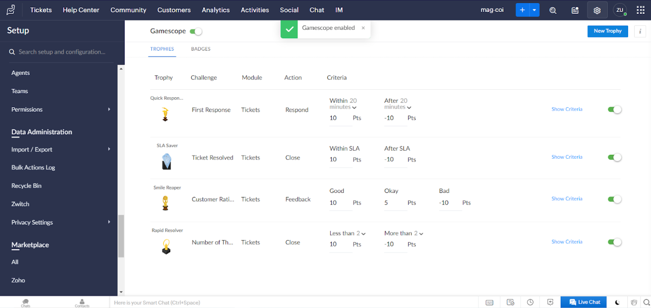 În afară de insigne, puteți introduce și trofee. Acestea sunt recompensate pe baza îndeplinirii diferitelor sarcini de asistență. Ceea ce este interesant în legătură cu această caracteristică este că puteți configura trofeele pe baza punctelor pozitive și negative. În timp ce primele puncte apropie agentul de primirea unui trofeu, cele din urmă îl îndepărtează de această realizare. Aceasta este o modalitate amuzantă și competitivă de a vă menține agenții concentrați și în fruntea jocului în orice moment.