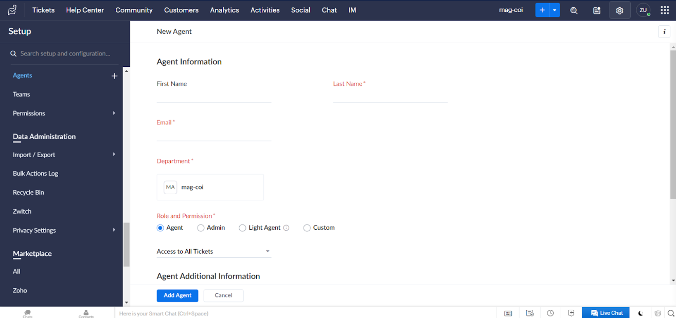 Nerăbdător să testez software-ul, am mers mai departe și am adăugat toți agenții de testare pentru a examina în mod corespunzător caracteristicile de gamificare din ambele părți. Pentru a adăuga agenți, mi s-a cerut să furnizez o serie de informații. Acestea includeau numele și prenumele, adresele de e-mail și departamentul din care făceau parte. De asemenea, le-am atribuit rolurile și permisiunile potrivite. Mai există câteva setări pe care le puteți configura pentru agenții dvs. dacă doriți să fiți minuțioși, dar am ales să trec peste ele doar pentru că nu erau atât de importante pentru funcția de gamificare.