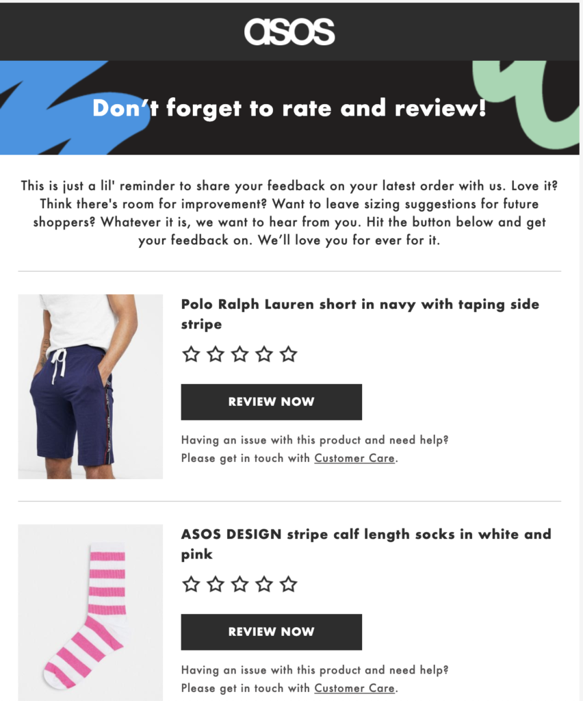 O altă soluție ar putea fi trimiterea e-mailurilor care sunt agregate săptămânal, lunar sau trimestrial după vânzare. De asemenea, ați putea lua în considerare includerea unui link către un sondaj de satisfacție a clienților post-vânzare în fiecare e-mail de confirmare a expedierii unui produs. Cu toate acestea, această soluție poate avea ca rezultat o depunere redusă și rate de conversie.